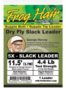 Het assortiment Frog Hair leaders is indrukwekkend. Het bestaat uit 15 verschillende typen voor zeer uiteenlopende omstandigheden en vissoorten. Elke leader is doordacht ontworpen voor elke specifieke situatie, van een lange slack leader voor het minimaliseren van drag op glasheldere beekjes, of een zeer korte, steil getaperde pocket water leader voor rotsige bergbeekjes, tot een IGFA geclassificeerde Tarpon leader voor de giganten van het tropische zoute water. Bedenk het, en Frog Hair heeft er een specialty leader voor.
